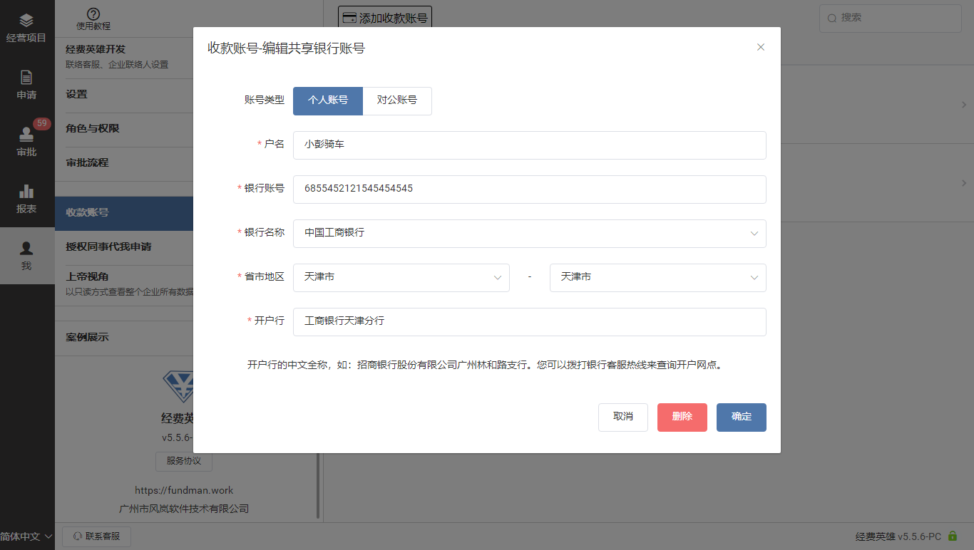 由管理员维护共享收款账号,方便员工申请填写时直接选择已录入的收款账号账号信息。