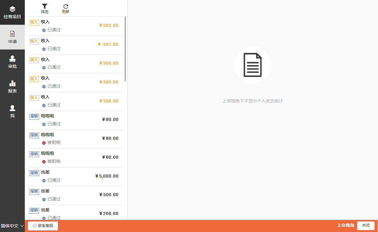 - 项目报表:查看整个项目,下属预算合并统计分析