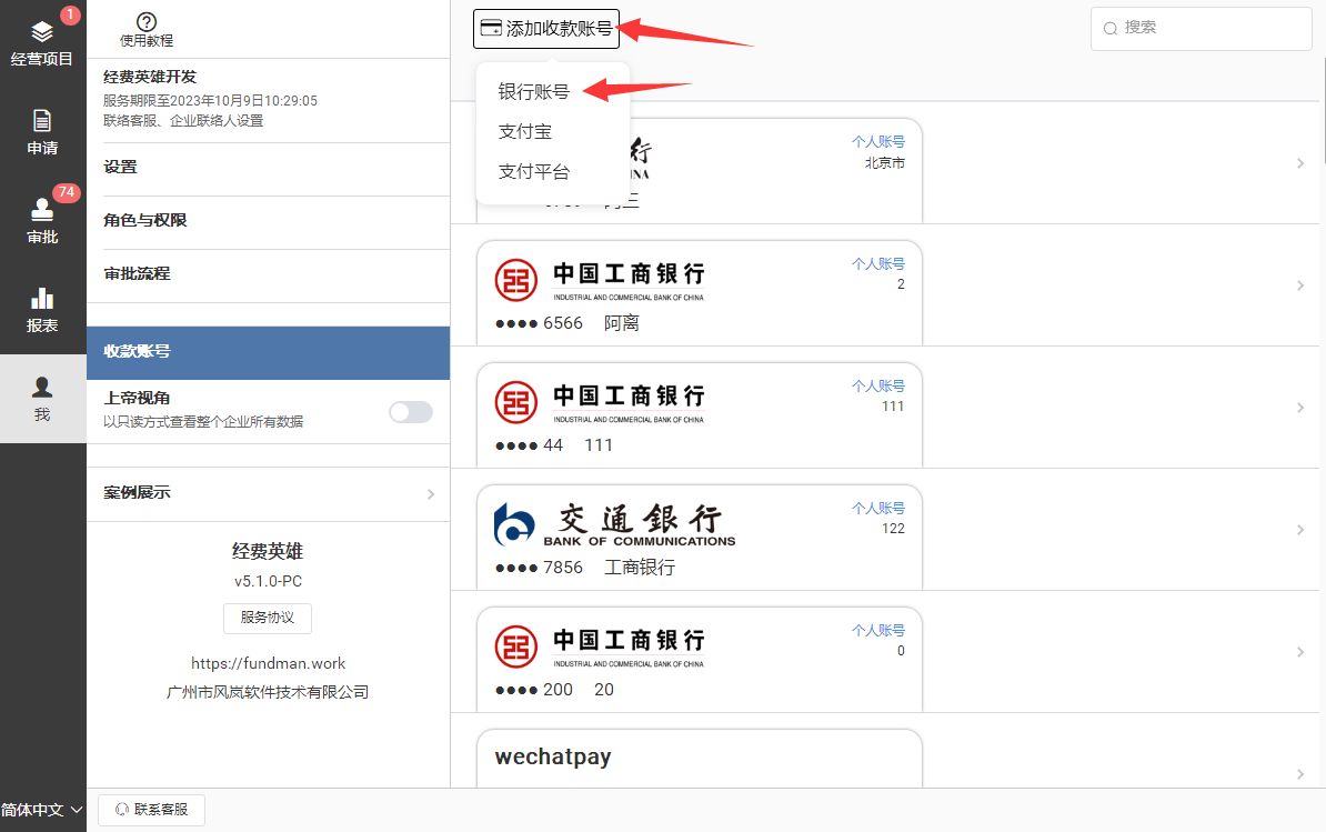 管理员有权限添加共享收款账号,让共享的账号信息供全企业使用。